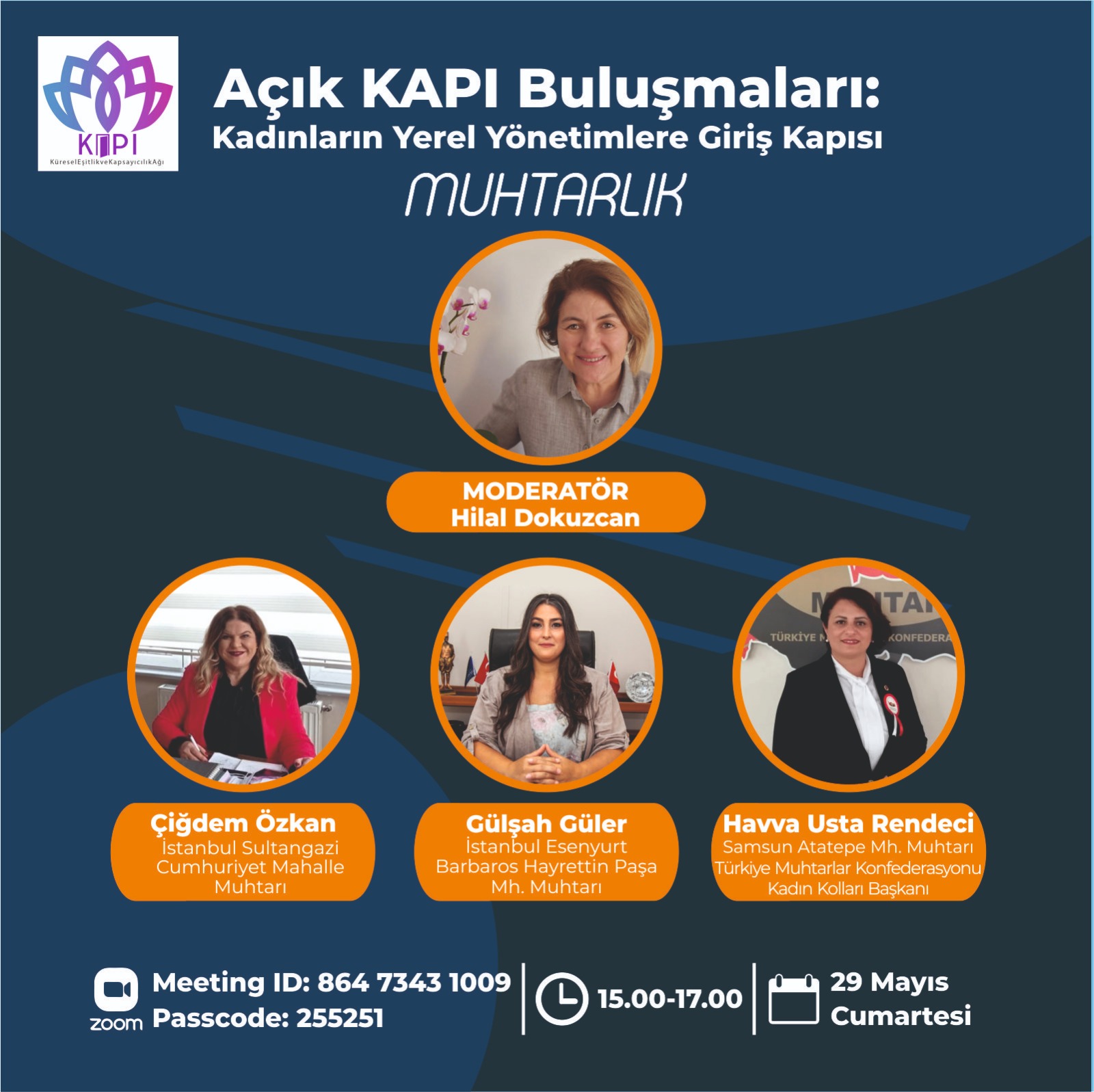 29 Mayıs Cumartesi günü 15:00-17:00 saatleri arasında Hilal Dokuzcan’ın moderatörlüğünde yapılacak toplantıya Sultangazi Cumhuriyet Mahallesi Muhtarı Çiğdem Özkan, İstanbul Esenyurt Barbaros Hayrettin Paşa Mahallesi Muhtarı Gülşah Güler ve Samsun Atatepe Mahallesi Muhtarı/Türkiye Muhtarlar Konfederasyonu Başkanı Havva Usta Rendeci konuk oluyor.
